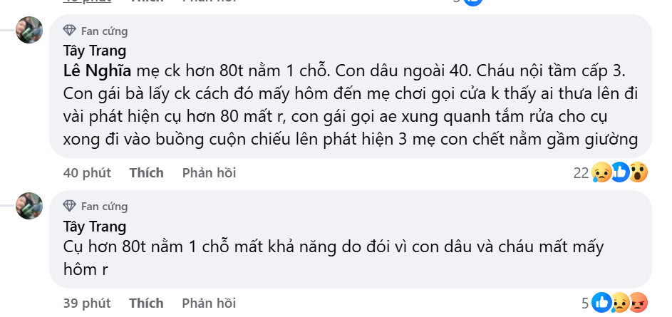 Những người này là con dâu và 2 cháu của bà Nh. Theo vị trưởng thôn, bà Nh. hàng ngày sống cùng cả gia đình con trai. Khi vụ việc được phát hiện, con trai bà Nh. không xuất hiện tại địa phương.