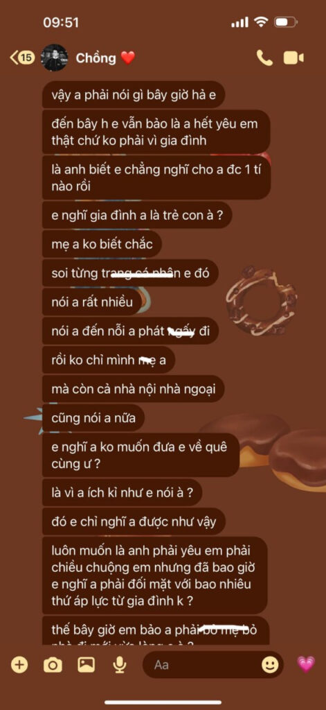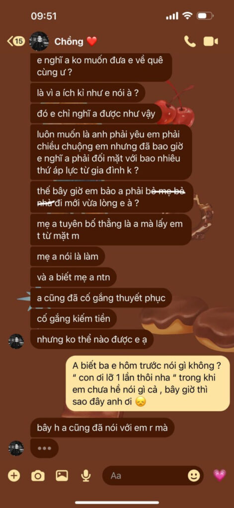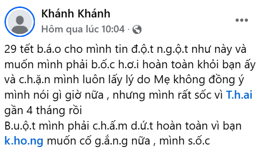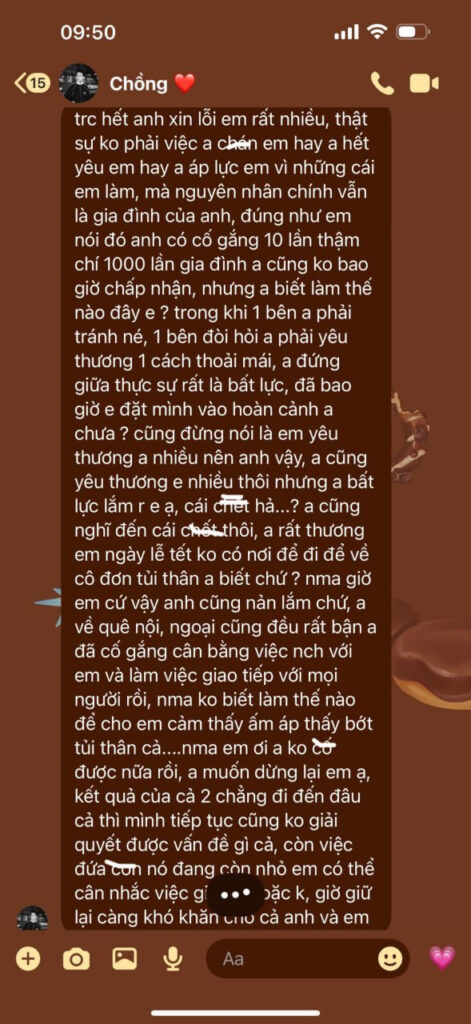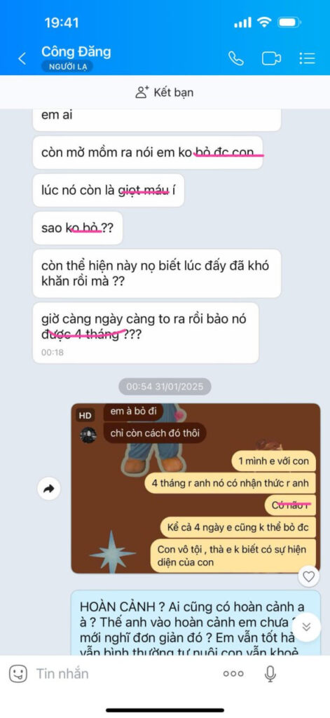 Bạn này có mối quan hệ tình cảm với một chàng trai sinh năm 2003 (gọi là Đ2003). Khi bạn mang thai gần 4 tháng, anh ta lấy lý do gia đình không chấp nhận và áp lực kinh tế để cắt đứt liên lạc với bạn ngay trước Tết 2025. Tuy nhiên, vào đêm Giao thừa, anh ta bí mật tổ chức lễ nhận “vợ mới” trong khi vẫn qua lại với bạn trước đó.