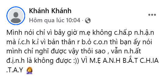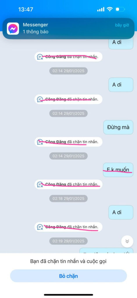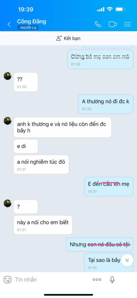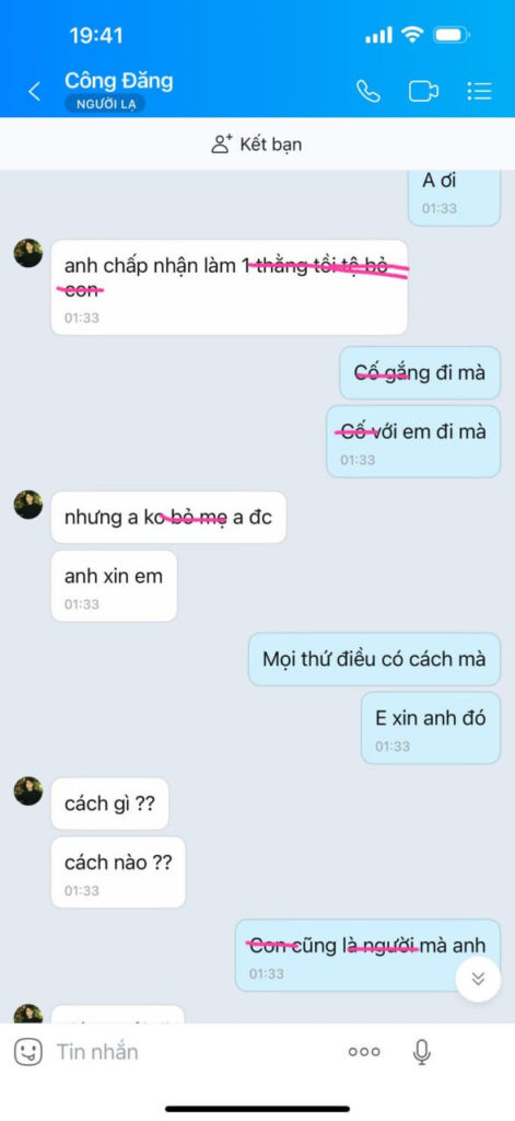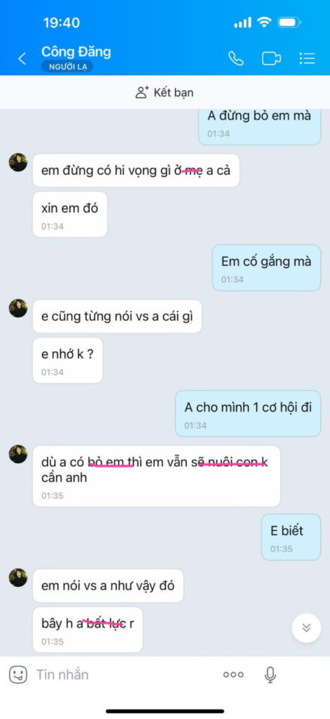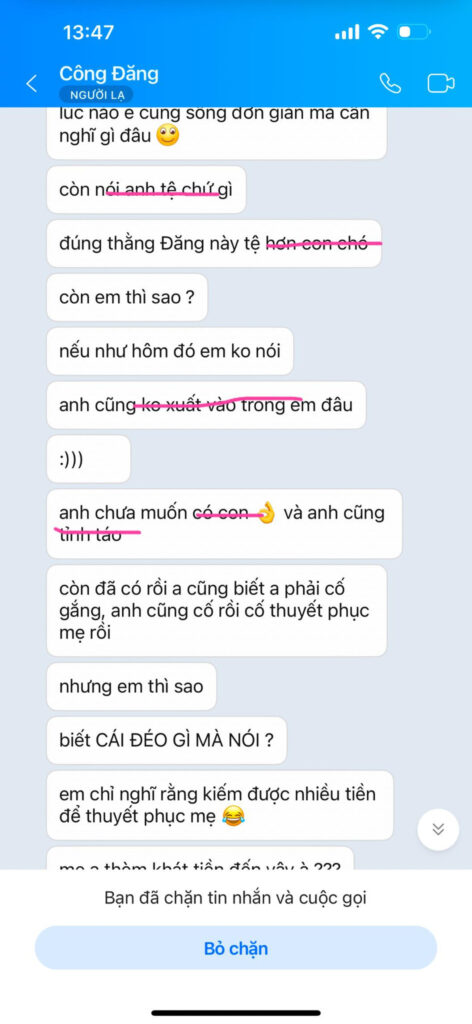 Khi bạn cố gắng liên lạc và thuyết phục anh ta chịu trách nhiệm, anh ta lạnh lùng từ chối, chặn mọi liên hệ, thậm chí xúc phạm bạn. Khi bạn tìm đến nhà anh ta ở Thanh Hóa để nói chuyện với gia đình, mẹ anh ta không những không tiếp nhận mà còn chửi bới, miệt thị bạn, thậm chí dọa đánh. Sau đó, bạn phát hiện anh ta đã phản bội mình từ lâu, bắt cá nhiều tay, tán tỉnh nhiều người trên ứng dụng hẹn hò.