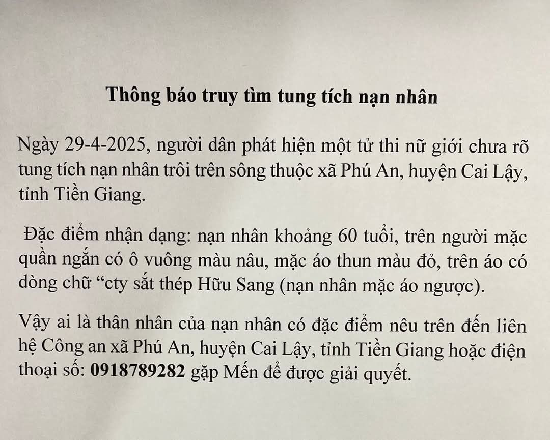 Phát hiện 1 thithe nữ chưa rõ thân nhân được người dân vớt lên ở ấp 02 Phú An, Cai Lậy, Tiền Giang
